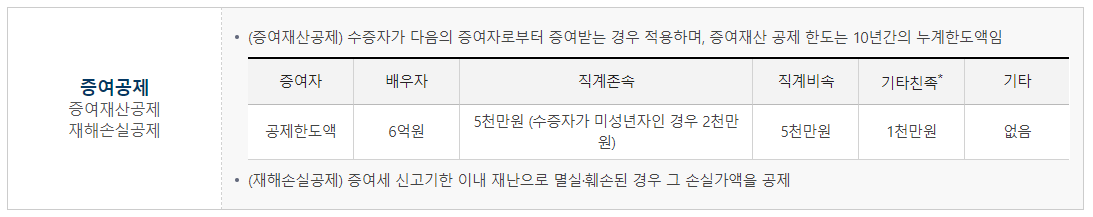 -직계존속: 5천만 원 (수증자가 미성년자인 경우 2천만 원)