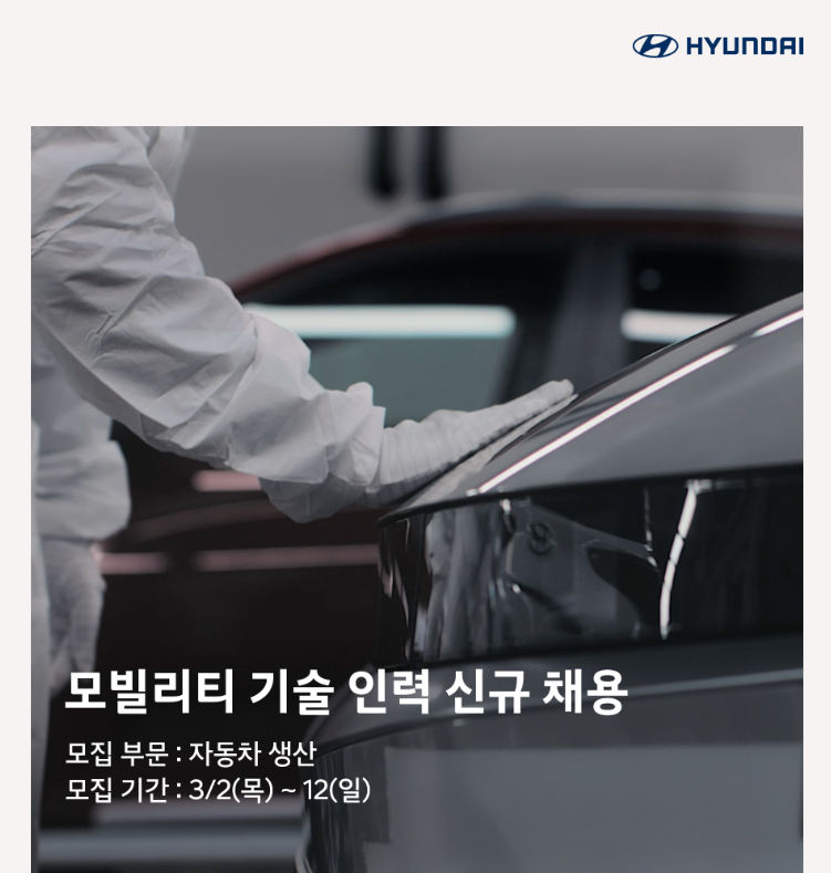때문에 취준생이나 많은 직장인들이 지원을 하고 있습니다. 특히 2023년 올해는 10년만의 생산직 채용이므로 지원자 또한 10만명 이상이 될 것이라고 예상하고 있으므로 현대차 생산직 채용을 지원하시는 분이라면 전략을 잘 짜서 준비하셔야 할 것 같습니다.